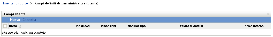 Il pannello Campi utente mostra i campi definiti esistenti insieme alle seguenti informazioni: