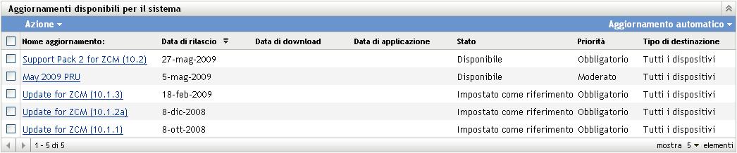Visualizza il tipo di aggiornamento, come: Server ZENworks: l'aggiornamento è valido solo per i server ZENworks. Tutti i dispositivi: l'aggiornamento è valido per tutti i dispositivi gestiti, inclusi i server ZENworks. |