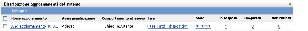 Stato attuale della distribuzione dell'aggiornamento per il dispositivo. Fare clic sulla voce dello stato per visualizzare le informazioni corrispondenti. Per ulteriori informazioni sugli stati individuali, vedere Sezione 17.0, Stati di aggiornamento. |