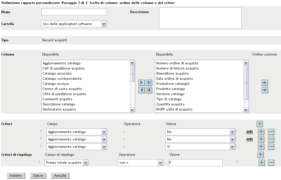 Criteri di riepilogo: selezionare i criteri di filtraggio di riepilogo nei campi , e . Utilizzare le icone + per aggiungere i filtri o fare clic sull'icona - per eliminarli. Fare clic su o per spostarsi tra gli operatori.