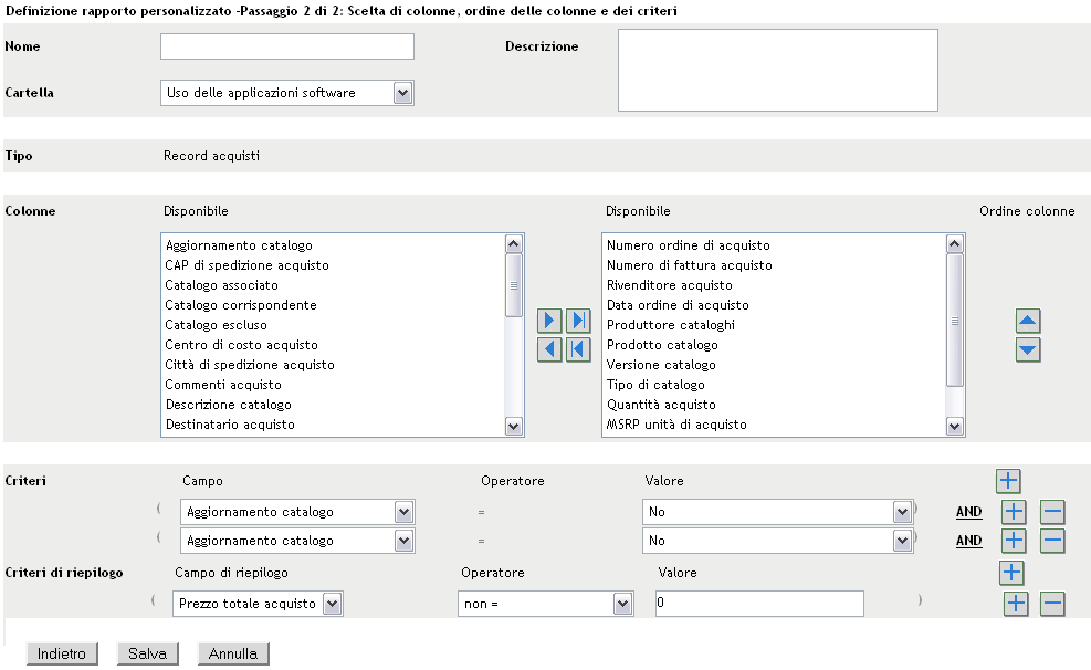 Colonne: dall'elenco a sinistra, selezionare i dati che si desidera includere nel rapporto. Utilizzare le icone a freccia per spostare i dati selezionati nell'elenco a destra. Utilizzare la combinazione di tasti Ctrl + Clic per selezionare più opzioni contemporaneamente. Utilizzare le icone su e giù per impostare l'ordine di visualizzazione dei dati.