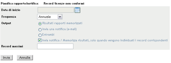 Output: scegliere se archiviare il rapporto, inviare una notifica via e-mail quando il rapporto è pronto o entrambi. È inoltre possibile scegliere di archiviare i risultati o inviare una notifica solo quando vengono trovati record corrispondenti. Per ulteriori informazioni sulla configurazione di indirizzi e-mail, vedere Sezione 10.2.5, Configurazione degli indirizzi e-mail per l'invio di notifiche.