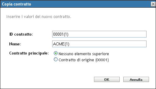 ID contratto: specificare un nuovo identificatore per il contratto. L'ID del contratto non può corrispondere ad altri ID contratto presenti nella stessa cartella.