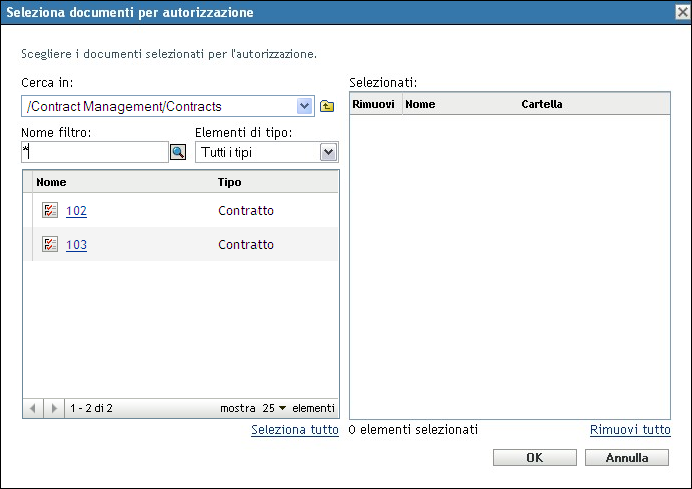 2. Nella finestra di dialogo Seleziona documenti per autorizzazione, specificare un contratto, quindi fare clic su OK.