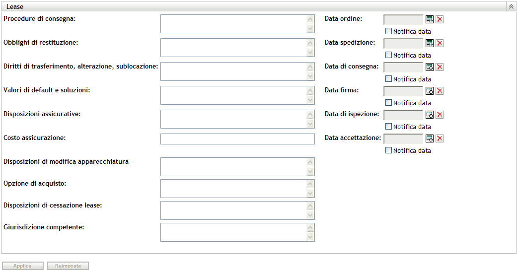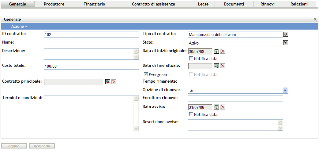 La scheda contiene le informazioni generali sul contratto che è stato creato con la Creazione guidata del nuovo contratto. È possibile modificare direttamente questi campi.