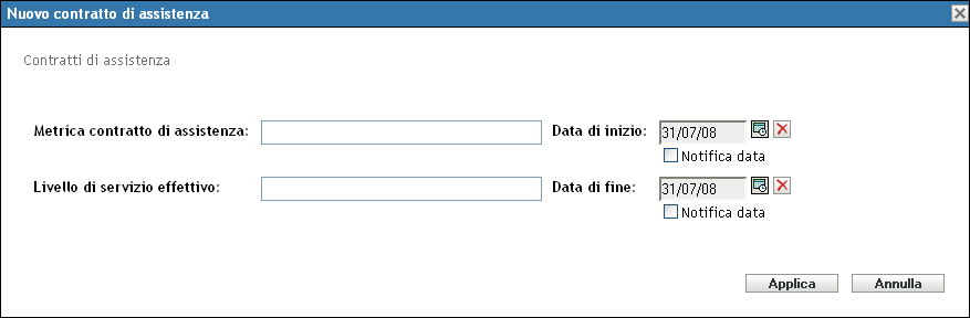 Nella finestra di dialogo, specificare il valore metrico del contratto di assistenza e il contratto di assistenza attuale, quindi selezionare le date di inizio e di fine.