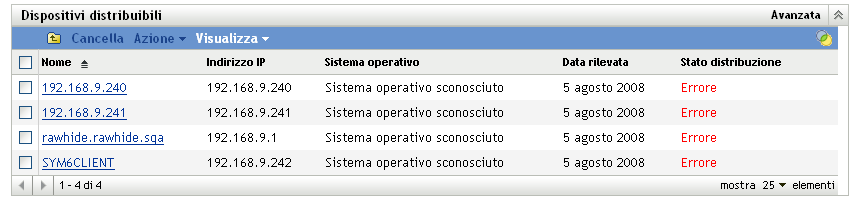 Utilizzando questo riquadro รจ possibile distribuire l'agente Adaptive ai dispositivi, rimuovere i dispositivi dal database ZENworks o ignorarli filtrandoli dall'elenco.