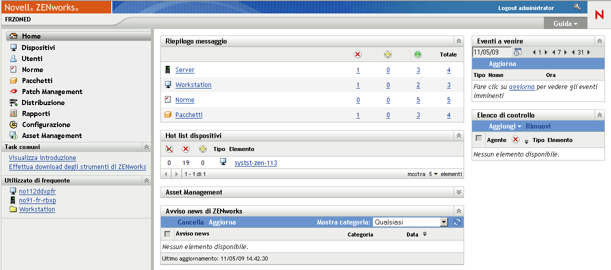Il sistema ZENworks viene amministrato a livello di zona di gestione tramite il Centro di controllo ZENworks (ZCC), una console con browser Web basata su task. Nel grafico riportato di seguito è illustrata la sezione di ZCC visualizzata tramite il browser Web: