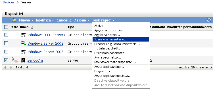 3. Nel pannello dei task del dispositivo fare clic su Scansione inventario server nel caso di un server, oppure Scansione inventario workstation nel caso di una workstation.
