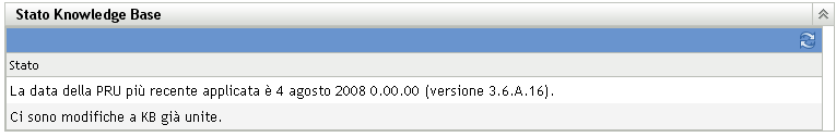 Il pannello Stato Knowledge Base (Configurazione > Inventario risorse) mostra la data dell'ultimo aggiornamento del riconoscimento prodotti (Product Recognition Update, PRU) e l'eventuale disponibilità di prodotti software locali appena definiti pronti da unire alla Knowledge Base.