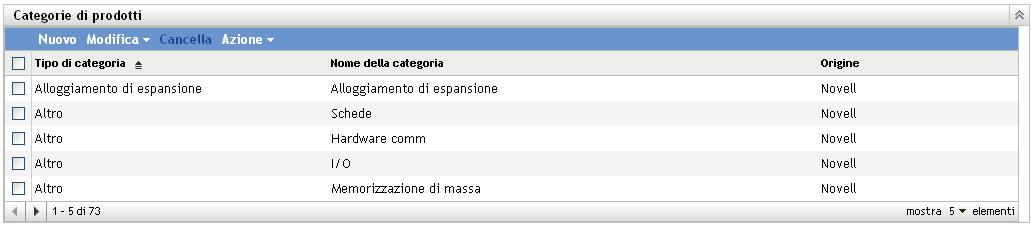 Verrà visualizzato il pannello Sottocategorie prodotti con un elenco di tutte le sottocategorie predefinite per la categoria specificata con la relativa origine: Locale o Novell.