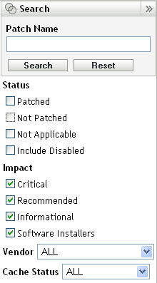 La sezione della pagina Patch fornisce numerose opzioni avanzate per la ricerca e il filtraggio dei dati, che consentono di ricercare patch specifiche e di filtrare gruppi di risultati in base allo stato e all'impatto delle patch. È possibile eseguire la ricerca e il filtro indipendentemente l'una dall'altro oppure è possibile combinarli per aumentare le funzionalità di drill down. La seguente figura mostra la sezione :