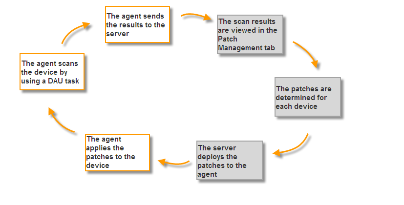 Il ciclo di rilevamento delle patch inizia ogni giorno sul server ZENworks in cui viene pianificato un task di rilevamento degli aggiornamenti applicabili (DAU, Discover Applicable Updates) per tutti i dispositivi ZENworks gestiti (server e workstation).
