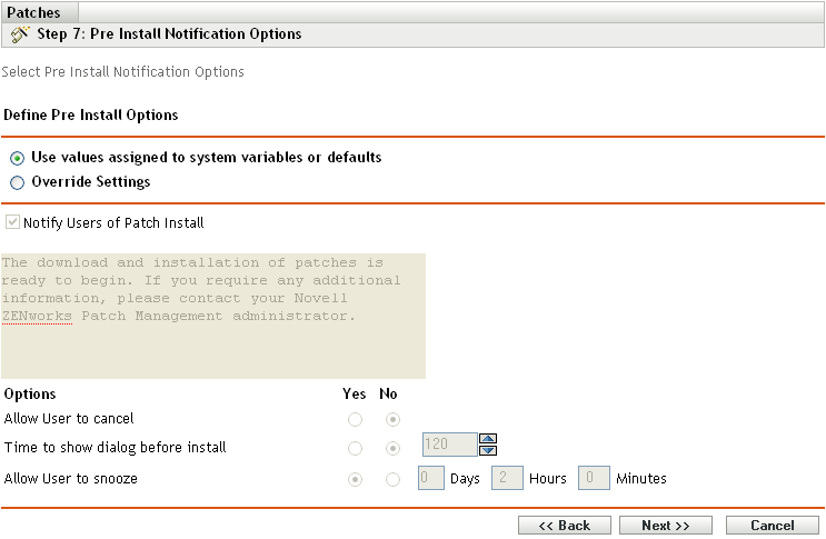 Nella pagina Opzioni di notifica preinstallazione della risoluzione guidata per la distribuzione è possibile definire se gli utenti ricevono una notifica al download e all'installazione delle patch e personalizzare tale notifica. Impostare la notifica e consentire agli utenti di annullare le opzioni sono le operazioni del settimo passaggio della pianificazione della distribuzione di una patch selezionata.
