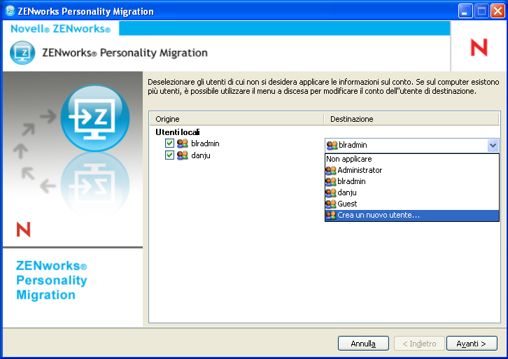 Personalizzato: consente di personalizzare le impostazioni della personalità e dei dati prima della migrazione al sistema di destinazione. È possibile scegliere di migrare la personalità a più utenti oppure creare nuovi utenti sul sistema di destinazione. Continuare con il Passaggio 7.