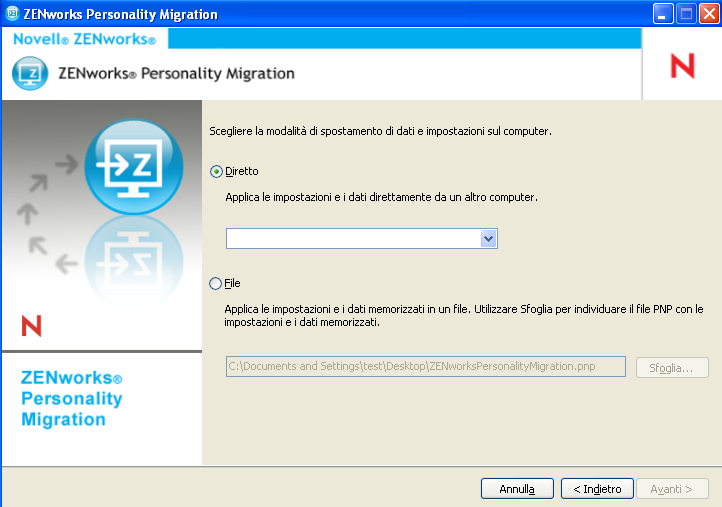 File: usa le impostazioni di migrazione e i dati memorizzati in un file PNP. Fare clic su per individuare e selezionare il file PNP salvato durante l'operazione di memorizzazione. Passare al Passaggio 7.