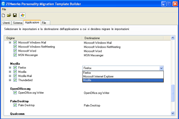 Selezionare un'applicazione di destinazione appropriata dall'elenco a discesa nella colonna . ZENworks Personality Migration supporta la migrazione delle impostazioni delle applicazioni tra: