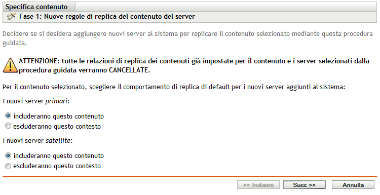 Si noti che tutte le relazioni di replica di contenuto precedentemente impostate fra contenuto e server andranno perdute al termine di questa procedura guidata.