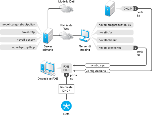 Le sezioni che seguono illustrano il funzionamento dei servizi di preavvio per l'avvio PXE, l'imaging di ZENworks e l'imaging di terze parti su un satellite di imaging: