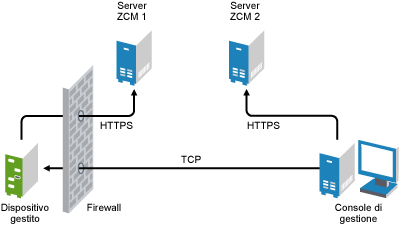 In questo caso, la sessione remota è avviata dall'amministratore sulla console di gestione. La console di gestione è in genere ubicata in una rete aziendale e il dispositivo gestito può trovarsi all'interno o all'esterno della rete aziendale. Nell'illustrazione che segue è raffigurata una sessione remota avviata sul dispositivo gestito dalla console di gestione.