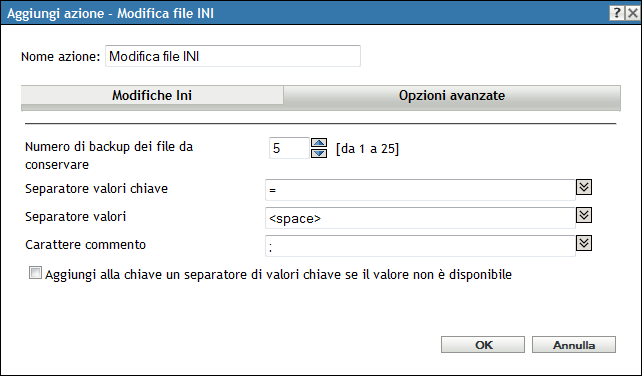 Figura E-8 Finestra di dialogo Azione - Modifica file INI: pagina Opzioni avanzate