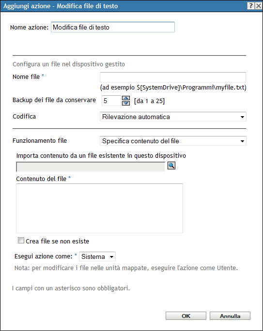 Contenuto file: se si seleziona la casella di controllo , è necessario specificare il contenuto del nuovo file che verrà creato se il file specificato non esiste.
