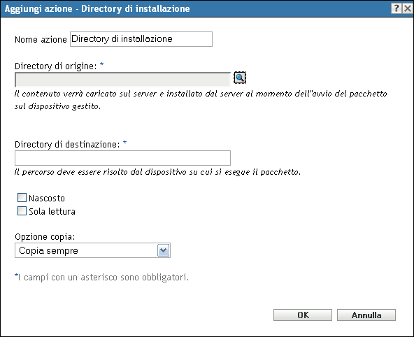 La finestra di dialogo Azione - Installa directory permette di specificare la directory da installare, specificare un percorso di destinazione, se la directory sia nascosta o di sola lettura dopo essere stata installata sul dispositivo, e specificare un'opzione di copia. È inoltre possibile utilizzare questa pagina per installare l'estensione Novell File Upload che consente di individuare le directory.