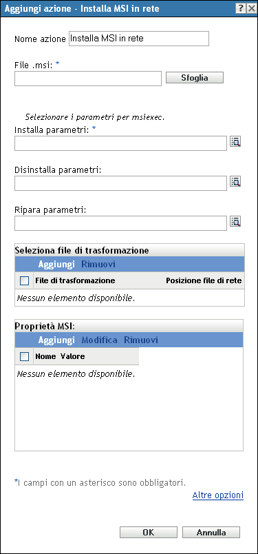 La finestra di dialogo Azione - Installa MSI di rete permette di specificare l'ubicazione del file MSI, i suoi parametri Installa, Disinstalla e Ripara, il file di trasformazione e il livello di sicurezza del file eseguibile.