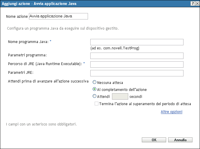 La finestra di dialogo Azione - Avvia applicazione Java permette di configurare un programma Java* da eseguire sul dispositivo gestito.