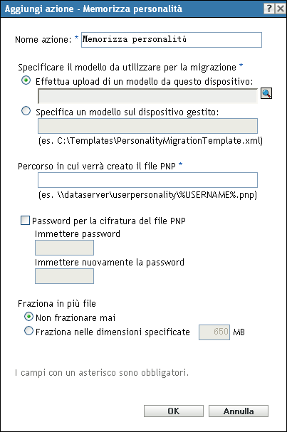 La pagina Memorizza personalità permette di specificare il modello di migrazione della personalità e il percorso in cui il file PNP (Platform Neutral Package) deve essere creato.
