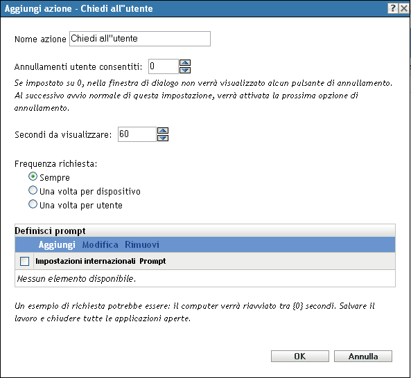 Secondi da visualizzare: specificare il numero di secondi di visualizzazione della richiesta prima di eseguire l'azione. Si supponga, ad esempio, di configurare la visualizzazione di una richiesta durante l'installazione di un'applicazione prima che il dispositivo esegua un riavvio obbligatorio. Se si specifica che l'utente può annullare il gruppo di azioni e che la richiesta deve rimanere visualizzata per 10 secondi, la richiesta rimarrà visualizzata per 10 secondi, quindi il dispositivo verrà riavviato.