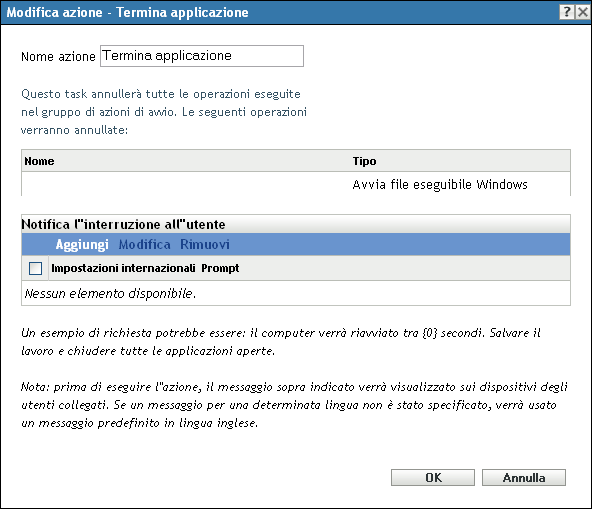 La finestra di dialogo Azione - Termina applicazione permette di annullare tutte le operazioni eseguite nel gruppo di azioni di avvio. È inoltre possibile configurare un messaggio di notifica dell'interruzione agli utenti.