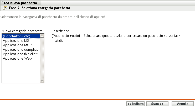 Pacchetto vuoto: pacchetto senza task iniziali. Questa categoria di pacchetto è utile per creare rapidamente un pacchetto senza dover effettuare tutti i task previsti dalla Creazione guidata nuovo pacchetto. Dopo aver creato un pacchetto vuoto, è possibile modificarne i dettagli aggiungendo assegnazioni, azioni e così via in seguito.