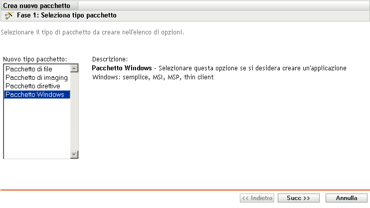 Un pacchetto Windows consente di distribuire un pacchetto Microsoft* Windows Installer (MSI), un pacchetto Microsoft Windows Software Patch (MSP), un'applicazione thin-client o altre applicazioni basate su Windows su un dispositivo Windows.