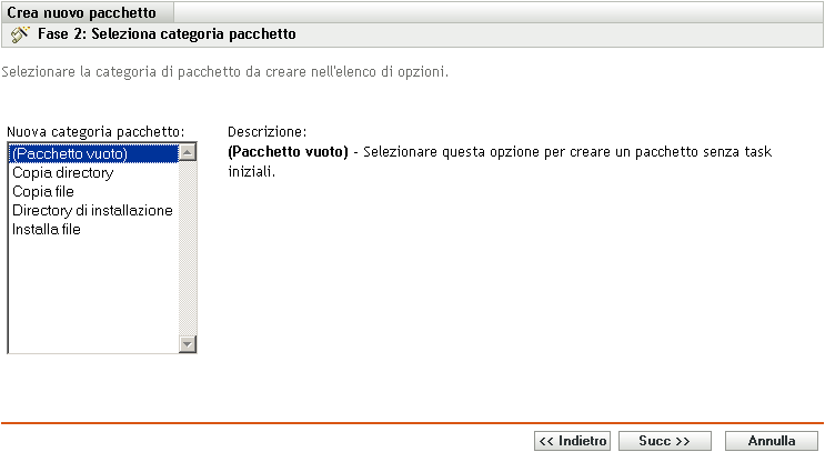 Pacchetto vuoto: pacchetto senza task iniziali. Questa categoria di pacchetto è utile per creare rapidamente un pacchetto senza dover effettuare tutti i task previsti dalla Creazione guidata nuovi pacchetti. Dopo aver creato un pacchetto vuoto, è possibile modificarne i dettagli aggiungendo assegnazioni, azioni e così via in seguito.