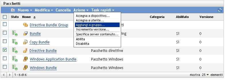 È possibile aggiungere il pacchetto a qualsiasi gruppo di pacchetti esistente oppure creare un nuovo gruppo di pacchetti durante il processo di assegnazione. Il gruppo eredita le assegnazioni e le pianificazione del gruppo. Ciò consente di risparmiare tempo perché è possibile gestire un solo gruppo di pacchetti anziché i singoli pacchetti. L'aggiunta di un pacchetto a un gruppo non equivale ad assegnare un pacchetto a un gruppo (di utenti o dispositivi). Per ulteriori informazioni sull'assegnazione di pacchetti ai dispositivi, vedere Assegnazione di pacchetti esistenti a dispositivi; per ulteriori informazioni sull'assegnazione di pacchetti agli utenti, vedere Assegnazione di pacchetti esistenti a utenti.