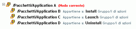 Un albero Pacchetti di dipendenze mostra le informazioni di concatenamento del pacchetto e i gruppi di azioni in cui si trova ciascuna dipendenza. Per visualizzare l'albero Pacchetti di dipendenze nel Centro di controllo ZENworks, fare clic sulla scheda Pacchetti, selezionare un pacchetto che include pacchetti dipendenti, quindi nella scheda Riepilogo fare clic sul collegamento Visualizza dipendenze pacchetto nella riga Pacchetti di dipendenze. Se il pacchetto selezionato non include pacchetti dipendenti, nel collegamento verrà visualizzato Nessuno anziché Visualizza dipendenze pacchetto.