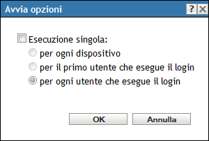 La finestra di dialogo delle opzioni di avvio consente di configurare la frequenza di esecuzione delle azioni di avvio del pacchetto sui dispositivi gestiti. Per default, le azioni di avvio vengono eseguite in base alla pianificazione del pacchetto, oppure quando l'utente avvia il pacchetto mediante la relativa scorciatoia (dalla finestra dell'applicazione, dal desktop e così via).