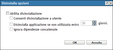 La finestra di dialogo Opzioni di disinstallazione consente di disinstallare l'applicazione, eseguire la disinstallazione e specificare che l'applicazione sarà disinstallata se non viene utilizzata entro un numero specifico di giorni.