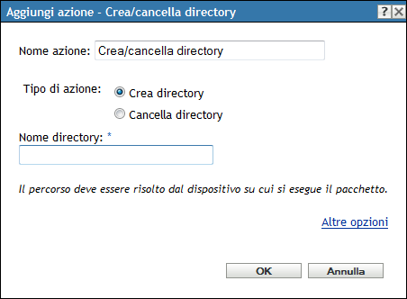 Nome directory: specificare il percorso completo della directory da creare o cancellare sul dispositivo gestito. Questo percorso deve essere risolto dal dispositivo sul quale viene eseguito il pacchetto.
