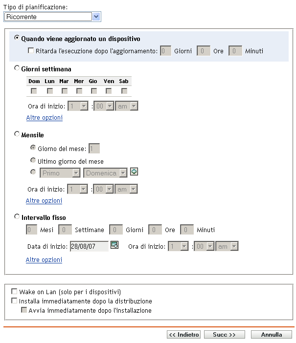 NOTA:nelle seguenti sezioni sono illustrate tutte le opzioni di pianificazione ricorrenti. Alcune opzioni possono non essere disponibili, in base all'evento o all'azione pianificata.