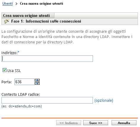 Specificare le informazioni necessarie per creare una connessione con la directory LDAP:
