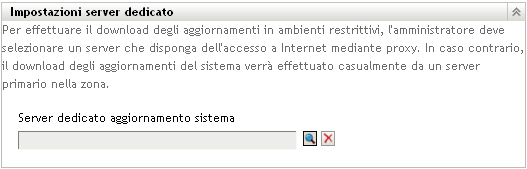 Per default, è possibile utilizzare casualmente qualsiasi server primario disponibile nella zona di gestione per scaricare gli aggiornamenti. È tuttavia possibile specificare un server ZENworks da dedicare alla gestione degli scaricamenti degli scaricamenti per il sistema. Il server selezionato deve disporre dell'accesso a Internet, direttamente o mediante un server proxy.