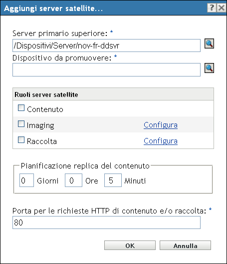 Pianificazione replica del contenuto: specificare la frequenza, in numero di giorni, ore e minuti, con cui si desidera venga aggiornato il contenuto del satellite da parte del server primario superiore.