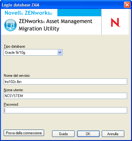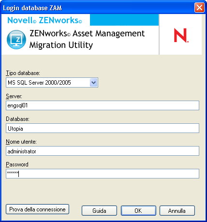 L'origine della migrazione è il database di ZENworks Asset Management 7.5. L'utility di migrazione richiede l'esecuzione del login all'origine per la migrazione con privilegi di creazione, modifica ed eliminazione. Per eseguire il login al database: