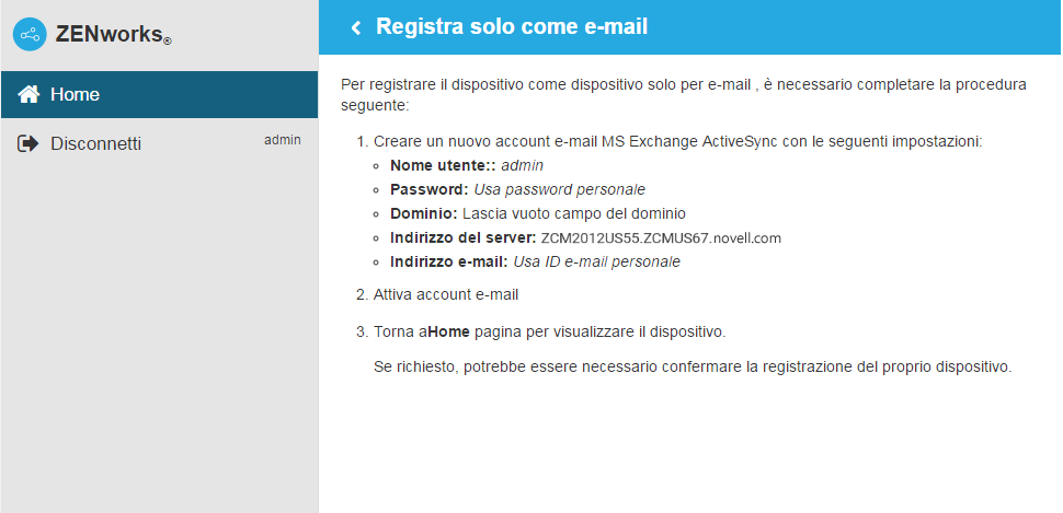 Dopo la registrazione di ZENworks Agent App, basata sulla policy e-mail per dispositivi mobili assegnata, viene inviata un'e-mail all'utente contenente le impostazioni dell'account e-mail aziendale. È possibile accedere a tale e-mail dall'applicazione Web del client e-mail o da qualsiasi altro dispositivo. Con queste informazioni, l'utente deve configurare manualmente l'account e-mail sul dispositivo per inviare o ricevere e-mail aziendali. È necessario configurare un server SMTP per consentire a ZENworks di inviare queste notifiche e-mail. Per ulteriori informazioni sulla configurazione di un server SMTP, vedere Event and Messaging Settings in ZENworks Management Zone Settings Reference (in lingua inglese).