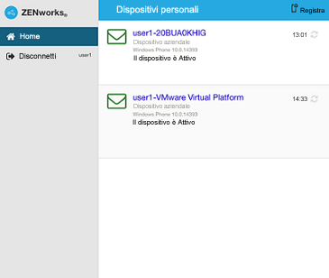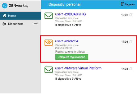 NOTA:se il dispositivo rimane a lungo nello stato di Registrazione in corso, nel portale utente ZENworks toccare l'icona di aggiornamento visualizzata in corrispondenza del dispositivo.