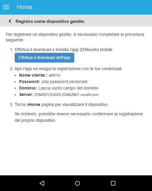 Nome utente, Password, Dominio, URL server: usare gli stessi nome utente, password e dominio di registrazione (se richiesto) utilizzati inizialmente per eseguire il login al portale utente ZENworks, unitamente all'URL server del server MDM ZENworks. È possibile ottenere tali informazioni dal portale utente ZENworks, come visualizzato al Passaggio 4.