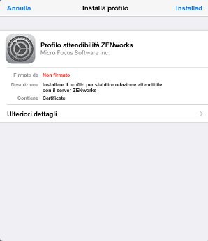 Toccare Effettua il download del certificato per visualizzare la schermata Installa profilo.