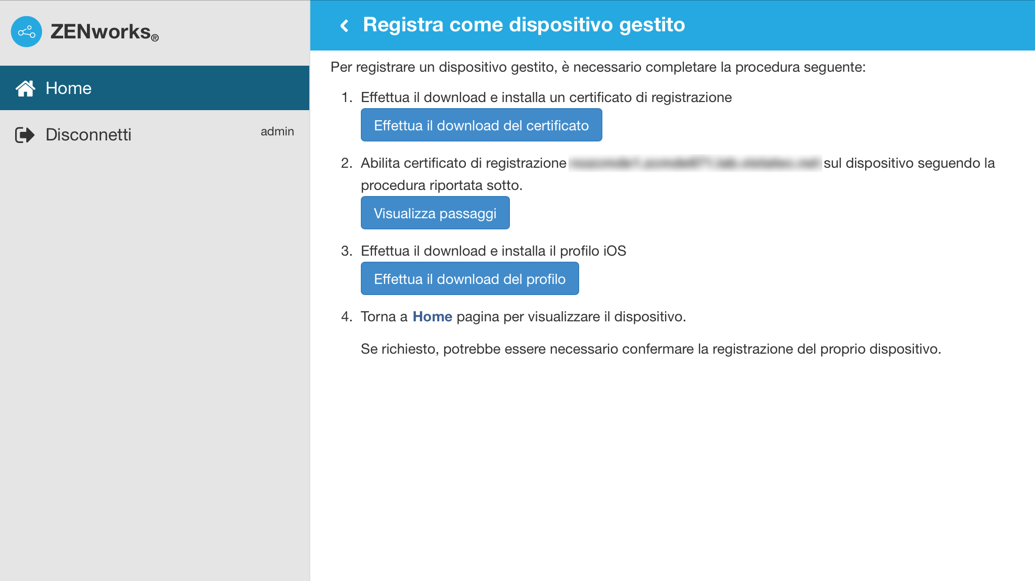 Per completare il processo di registrazione, fare clic sul collegamento al portale per l'utente finale ZENworks fornito nell'e-mail o visitare il Portale per l'utente finale ZENworks.